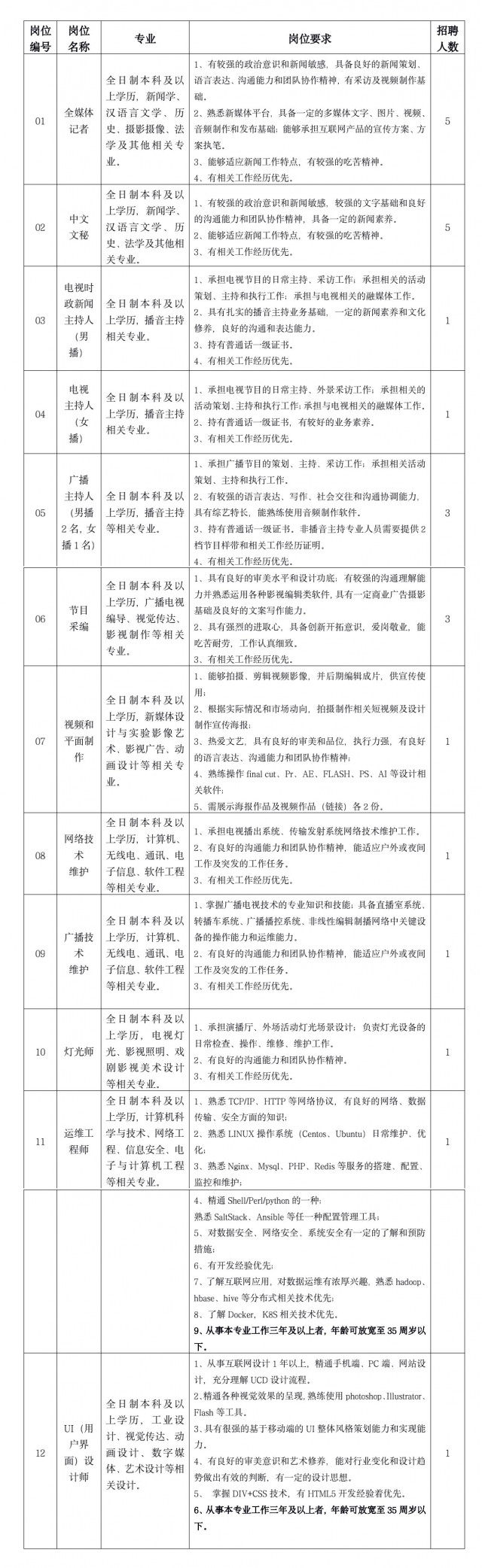 1、政治合格、遵纪守法、品行端正、身体健康。热爱广播电视事业,积极进取,开拓创新,符合相关岗位的招聘要求。