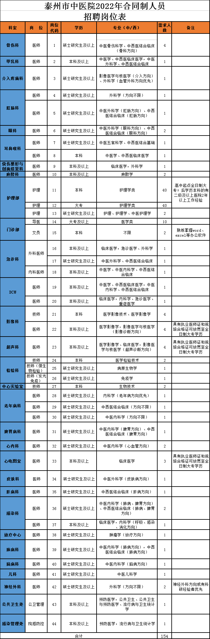 泰州市中医院是泰州市卫生健康委员会直属差额拨款事业单位,2022年计划招聘154名合同制人员,具体岗位、专业、学历等要求详见《泰州市中医院2022年合同制人员招聘岗位表》(见下表)。