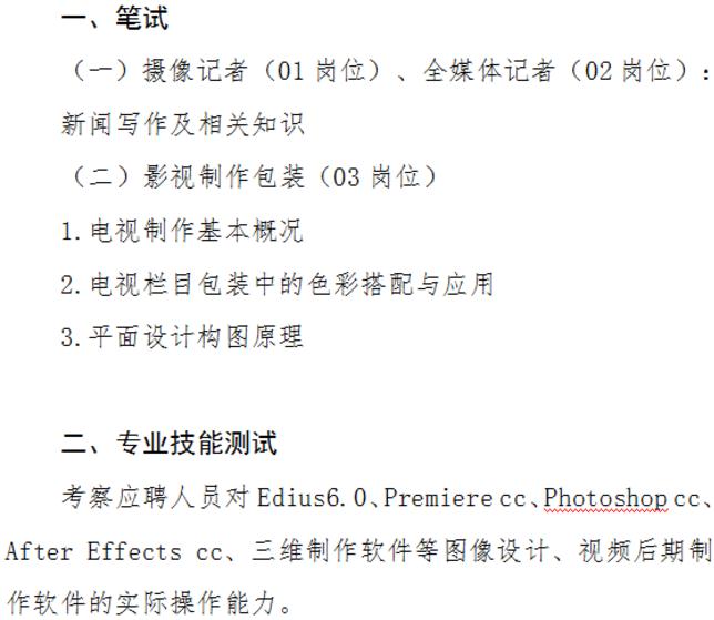 摄像记者(01岗位)、全媒体记者(02岗位)考试方式为笔试和面试,影视制作包装(03岗位)考试方式为笔试、面试和专业技能测试。