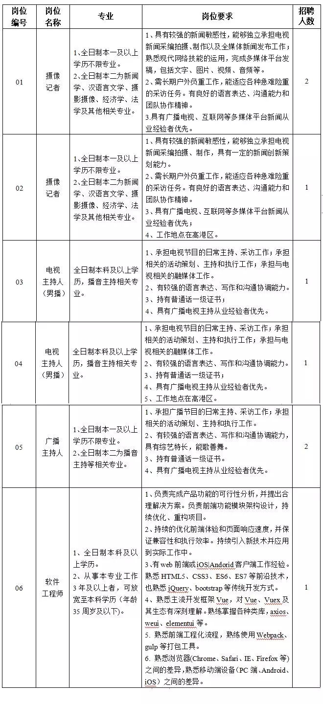 1、政治合格、遵纪守法、品行端正、身体健康。热爱广播电视事业,积极进取,开拓创新,符合相关岗位的招聘要求。
