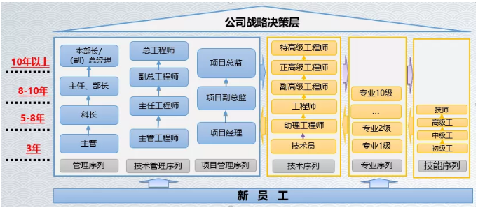 公司设计“管理、技术、专业、技能”四大职业发展通道及轮换路径,以可视化方法实现岗位职责、学习要求、能力及绩效要求、福利待遇等的显现化,打造内、外职业生涯相互提升的可视化职业生涯发展体系,为员工向上发展提供“牵引力”;级别调整带动薪酬的调整。